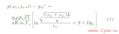 第i條裂縫就可以看成是一個以流動半徑為Ri,厚度為裂縫寬度wi,邊界壓力為裂縫尖端壓力p(xfi,yfi,t),滲透率為Kf,流壓pwf的微型氣藏,其流動方式可以看成徑向流,所以氣體在裂縫內(nèi)的流動過程可表示為: