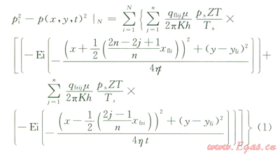 式中pi為原始地層壓力,Pa;p(x,y,t)為地層中點(x,y)在t時刻的壓力,Pa;qflij為第i條裂縫左端第j段的產(chǎn)量,m3/s;xfli、xfri分別為第i條裂縫左、右翼的長度,m;ps為地面標況下的壓力,Pa;Z為偏差因子;m為氣體黏度,Pa·S;K為地層滲透率,m2;h為產(chǎn)層厚度,m;t為滲流時間,s;T為地層溫度,K;ts為地面標準溫度,K;h為導壓系數(shù);yfi為第i條裂縫y方向坐標。