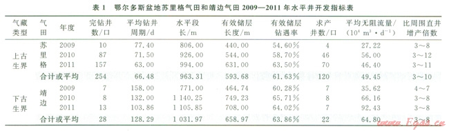 已累計(jì)完鉆的300余口水平井,主要集中于靖邊氣田和蘇里格氣田,開(kāi)發(fā)層系為下古生界馬家溝組馬五,3層和上古生界下石盒子組盒8段。針對(duì)上古生界氣藏地質(zhì)特征,通過(guò)二維地震選區(qū),三維地震提高含氣砂體預(yù)測(cè)精度,骨架井鉆探落實(shí),精細(xì)氣藏描述解剖,實(shí)現(xiàn)整體研究,整體部署,整體開(kāi)發(fā),水平井有效儲(chǔ)層鉆遇率大幅提高(大于60%),分段壓裂技術(shù)突破10段,單井產(chǎn)量平均達(dá)到直井的3~10倍,最高達(dá)到l2倍,單支鉆井隊(duì)最高實(shí)現(xiàn)一年中開(kāi)鉆6口井完鉆6口井,最短鉆井周期26.96d,最短建井周期39.67d,多口井無(wú)阻流量超過(guò)l00×104m3/a。生產(chǎn)表明,已投產(chǎn)的水平井占日開(kāi)井總數(shù)4.5%,產(chǎn)出約23%的氣量,開(kāi)發(fā)效果顯著(表1)。
