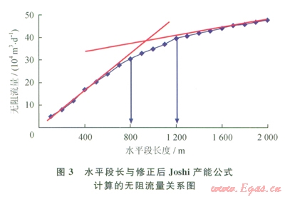 蘇里格氣田水平井開(kāi)發(fā)主力層為盒8段儲(chǔ)層,屬辮狀河沉積,河道遷移迅速,砂體在平面上和縱向上交替疊置。統(tǒng)計(jì)結(jié)果表明,砂巖鉆遇率多在70%以上,但有效砂體規(guī)模小,連續(xù)性和連通性差,鉆遇率多數(shù)小于50%。蘇l4井區(qū)、蘇6井區(qū)及蘇l0井區(qū)進(jìn)行的加密井網(wǎng)試驗(yàn)表明:有效單砂體厚度一般為2~6m,寬度400~800m,長(zhǎng)度900~1200m,以孤立型、切割疊置型、堆、積疊置型、橫向局部連通型賦存于地層中,僅在局部疊置規(guī)模較大。通過(guò)對(duì)盒8段為目標(biāo)層的233口水平井分析表明:平均有效儲(chǔ)層鉆遇率僅59.91%;單層有效砂體長(zhǎng)度小,僅l0口井l00%鉆遇有效砂體,其中7口井長(zhǎng)度大于l000m,最長(zhǎng)ll72m;96%井鉆遇多套砂體,泥巖段長(zhǎng)度大于50m的有l86口。表明砂巖在空間分布不均,非均值性強(qiáng)。水平段長(zhǎng)度、砂體長(zhǎng)度、有效儲(chǔ)層長(zhǎng)度三者正相關(guān),表明:水平段長(zhǎng)度越長(zhǎng),溝通多個(gè)砂體的機(jī)率更高;在800~1200m范圍內(nèi)儲(chǔ)層鉆遇率高(圖2),鉆穿多套砂體的有效儲(chǔ)層鉆遇率明顯下降;根據(jù)對(duì)已生產(chǎn)井的動(dòng)態(tài)分析,水平段長(zhǎng)度與井控儲(chǔ)量、無(wú)阻流量不呈線性增長(zhǎng)關(guān)系;應(yīng)用l6口生產(chǎn)時(shí)間較長(zhǎng)的水平井修正了Joshi非均質(zhì)氣藏水平氣井產(chǎn)能公式,進(jìn)而進(jìn)行計(jì)算后表明,隨著水平段長(zhǎng)度增加,無(wú)阻流量增加的幅度變緩,且在800~1200m出現(xiàn)拐點(diǎn)(圖3);動(dòng)靜態(tài)資料證明有效砂體在單層范圍內(nèi)展布局限,水平段長(zhǎng)度并非越長(zhǎng)產(chǎn)量越高。