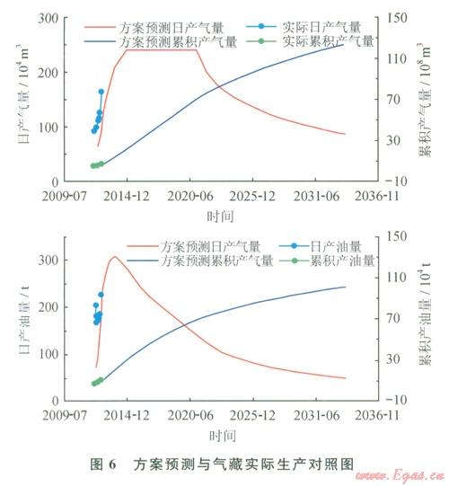 將相態(tài)恢復研究成果運用于氣藏模擬和方案預測中,氣井的產氣量、產油量、井l:3壓力等關鍵生產指標能夠得到較好擬合,在此基礎上建立氣藏預測模型預測氣藏產量,產氣量和產油量與實際吻合程度較高,油氣比基本吻合(圖6),高壓物性實驗、常規(guī)凝析氣藏類型判別與生產靜動態(tài)特征相結合的氣藏類型判別方法和相態(tài)恢復理論確定的氣藏類型是正確的、預測的凝析油含量是可靠的。