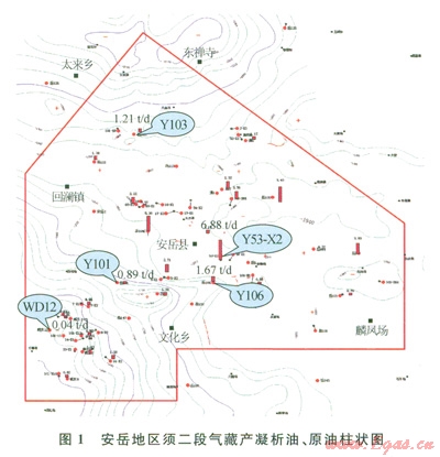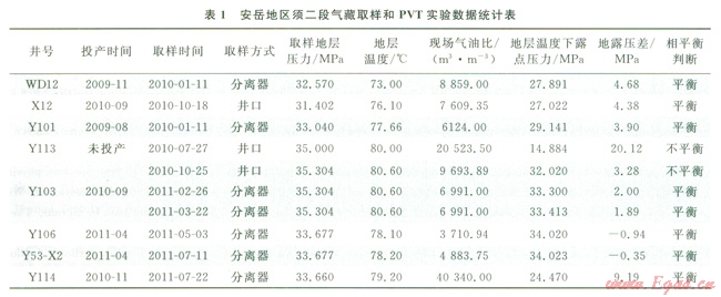 結合傳統(tǒng)與室內實驗判斷結果綜合分析安岳地區(qū)須二段氣藏為飽和凝析氣藏,由于儲層的非均質性導致了局部有少量原油存在,即使個別井口可能會出現開井初期產出大量原油的現象,但是隨著生產的進行,原油產出量也會迅速下降,由此,將安岳地區(qū)須二段氣藏類型確定為帶“油墊”的飽和凝析氣藏。從成藏的角度看,可能由于致密強非均質氣藏中原油的差異聚集或原油的裂解,致使局部存在少量原油。