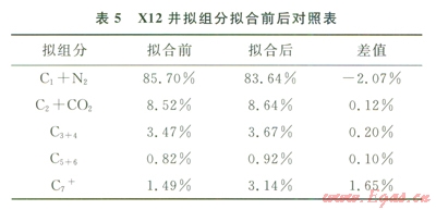 根據相態(tài)恢復理論,利用數值模擬軟件Eclipse中的高壓物性分析模型(PVTi),選取取樣時間早、相平衡較好的Xl2井的高壓物性實驗數據進行相態(tài)恢復。首先,對原始PVT數據進行模擬形成臨界參數場;然后,在目前壓力下,向平衡凝析氣中逐漸加入少量平衡油,再計算露點壓力,若計算的露點壓力低于地層壓力,則繼續(xù)在新的露點壓力下加入該壓力下的平衡油,直到露點壓力恢復到原始地層壓力?;謴偷皆嫉貙訅毫ο碌牧黧w組分,可以代表原始氣藏條件下的流體。相態(tài)恢復前后對照表表明,相態(tài)恢復后潛在凝析油含量C5+提高了1.75%,凝析油含量達到2499/m3(表5)。通過相態(tài)恢復模擬飽和凝析氣藏地層流體高壓物性特征,為開發(fā)技術政策制定和氣藏動態(tài)預測奠定了基礎。