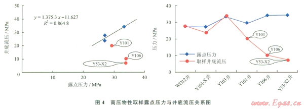 飽和凝析氣藏在分離器取樣進行PVT實驗,由于部分重質組分的丟失,通常表現出露點壓力與井底流壓呈線性關系。安岳地區(qū)須二段氣藏的WDl2、X12、Yl03井取樣壓力與實測露點壓力呈線性關系,且擬合相關性較好,R2=0.8648;而Yl01、Yl06和Y53-X2井則表現出過剩油的特征(圖4)。因此,該氣藏為飽和凝析氣藏是可以肯定的,是否就像傳統(tǒng)方法判斷的那樣具有“油環(huán)”,還需進一步論證。