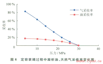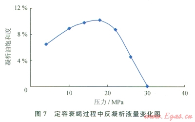 定容衰竭實驗表明當壓力衰竭至l8MPa時,反凝析液量達到最大為10.14%,而在分級壓力為4MPa時,凝析油的采收率為l6.99%,天然氣采收率為82.54%(圖7、8)。飽和凝析氣藏一當開井,在地層中即有凝析油析出,安岳地區(qū)須二段氣藏氣井目前的生產動態(tài)以及試井解釋分析表明近井地帶已經有凝析油析出,存在反凝析傷害。