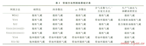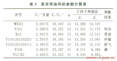 傳統(tǒng)氣藏類型判斷方法有相圖法[3]和經驗法,其中經驗法又有4種[2]之多。根據8個樣品擬合的相圖判斷,除2口氣井(Y106和Y53-X2)具有飽和凝析氣藏的特征外,其余樣品均只表現出凝析氣藏的特征(圖2、3);根據經驗判斷法,各井均為凝析氣藏,且四參數法、j1參數法、含氣系數與C2+含量關系法均判斷Yl06和Y53-X2井為飽和或者帶“油環(huán)”的凝析氣井(表2)。根據4種專門判斷是否帶油環(huán)的常規(guī)經驗法,安岳地區(qū)須二段氣藏7口井均為帶“油環(huán)”或者帶“大油環(huán)”的凝析氣藏(表3)。實際上,安岳地區(qū)須二段氣藏產原油井位置、層段與構造和海拔無關,尚未發(fā)現明顯的油氣界面,常規(guī)方法判斷氣藏類型與實際存在差異。