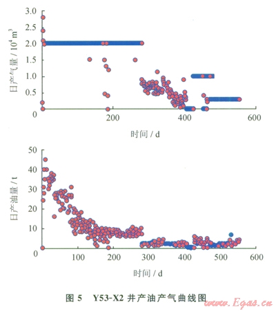 選取產油量最高的Y53-X2氣井進行分析,該井投產第一個月,平均日產氣2.04×104 m3,平均日產油35.27t,油氣比達到l7.29t/104m3,產出油密度0.8055g/cm3,含蠟量l3.63%,屬于原油。在實驗室測得Y53-X2井原始地層條件下飽和油的氣油比為216.49m3/m3,飽和凝析氣氣油比為4883.75 m3/m3,結合實際生產過程中產出流體的油氣比,計算該井不同時間產出天然氣與產出原油在地下的體積比(表4),結果表明產出流體中原油的比例迅速降低,表現為局部聚集原油的特征。Y53-X2井采氣曲線也表明隨著生產的進行,產出原油迅速下降,該井投產279d后,氣產量基本保持2×104m3/d,油產鰱從初期的45t/d降至2.0t/d(圖5),油產量及油氣比迅速下降,同樣說明井底附近原油有限。