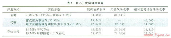 凝析氣藏通常的開采方式主要有衰竭式開采、循環(huán)注氣(露點壓力以上注氣和露點壓力注氣)以及單井吞吐[8-10]。實驗及理論研究證明多孔介質中凝析油的采收率高于PVT筒高壓物性實驗[11-13]。因此采用室內巖心物理模擬實驗優(yōu)選合理開發(fā)方式,結果表明在氣藏平均束縛水飽和度為49%,廢棄壓力為4MPa條件下,采用衰竭式開發(fā),凝析油采收率能夠達到33.48%,天然氣采收率為84.64%,在露點壓力以上注氣,能夠提高凝析油采收率40.06%,在反凝析液飽和度最大壓力下注氣,能夠提高凝析油采收率l4.06%,單井干氣吞吐和加甲醇段塞的單井干氣吞吐,分別提高凝析油采收率14.12%和l7.64%(表6)??紤]安岳地區(qū)須二段氣藏為低孔、低滲的砂巖氣藏,非均質性強,不建議采用循環(huán)注氣的開采方式,另外加甲醇段塞雖然能夠解除水鎖,降低氣液的界面張力,提高氣相相對滲透率[14],但是考慮到注入成本以及后期的處理,建議單井采用先衰竭后干氣吞吐的開采方式,可提高凝析油采收率,達到效益開發(fā)的目的。