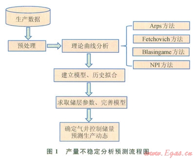 隨著氣井生產(chǎn)動態(tài)分析技術(shù)的不斷發(fā)展,逐漸形成了以生產(chǎn)數(shù)據(jù)為分析對象,對氣井進(jìn)行生產(chǎn)分析、評價和預(yù)測的新方法,稱為產(chǎn)量不穩(wěn)定分析法。該方法以Arps產(chǎn)量遞減分析、Fekovich曲線擬合分析、Biasingame現(xiàn)代遞減分析、NPI重整壓力積分曲線分析為基礎(chǔ)[10-13],綜合考慮儲滲特征、流體物性等情況,開展各種典型曲線、生產(chǎn)歷史曲線的擬合分析,不斷修正模型參數(shù),最終確定氣井生產(chǎn)動態(tài)模型,實現(xiàn)動態(tài)儲量計算和生產(chǎn)分析預(yù)測,分析流程如圖1所示。