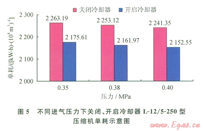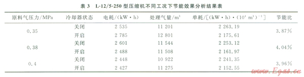 2)結合現場條件,對L-12/5-250型壓縮機第二、四級級間回氣管上加裝冷卻器后,在0.35、0.38、0.40Mpa,3種進氣壓力下取得的對應節(jié)能比分別為3.87%、4.04%、3.96%,驗證了該節(jié)能技術的可行性。