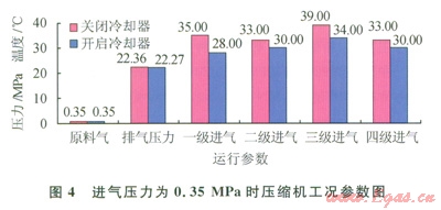 從表2的數據可看出,當進氣壓力為0.35 MPa時開啟冷卻器后壓縮機一級進氣溫度由35℃降低到28℃,溫度下降了7℃,其他參數對比分析如圖4所示。總之,在不同進氣壓力下,開啟冷卻器后壓縮機各級進氣溫度都有所下降,對第二、四級級間回氣的冷卻取得了降低壓縮機進氣溫度的效果。