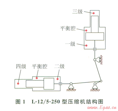 CNG加氣站一般由天然氣預處理、壓縮、儲存、控制以及CNG售氣等5個系統(tǒng)組成[3]。CNG壓縮機是壓縮系統(tǒng)的核心部分,一般為多級壓縮,采用中間冷卻與分離方式降溫、脫液[4]。某加氣站采用2臺L-1e/5—250型壓縮機,為2列四級壓縮(一、三級在豎直列,二、四級在水平列),中間冷卻,有油潤滑,氣缸和中間冷卻器為水冷結構,具有運轉平穩(wěn)、排氣量大、適用范圍廣、維護費用低等優(yōu)勢[5-6]。由于采用了級差式壓縮缸結構,同列壓縮缸壓力差別較大,氣體作用力差別較大,為了改善活塞桿的受力狀態(tài)和減小電機的負荷,在同列壓縮缸中間設有平衡腔來平衡活塞力[7]。L-12/5-250型壓縮機結構如圖l所示,其額定功率為126kw,排氣量為12m3/min,進氣壓力為0.5MPa,排氣壓力為25Mpa[8]。
