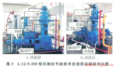 基于上述的節(jié)能技術原理,由于現場條件的限制,本次改造僅僅在L-12/5-250型壓縮機第二、四級級間回氣管線上加裝了一套冷卻器,冷卻器換熱面積為1.5,改造前后現場如圖3所示。為了系統(tǒng)分析節(jié)能改造的節(jié)能效果,在不改變冷卻系統(tǒng)和壓縮機系統(tǒng)其他設備參數的條件下,通過系統(tǒng)原有壓力、溫度、氣量、電耗等記錄儀表,分別測試了原料氣進氣壓力為0.35、0.38、0.40MPa下關閉和開啟冷卻器時壓縮機的運行參數和能耗,相關數據見表1、2。