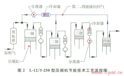L-12/5-250型壓縮機第二、四級級間回氣未經過冷卻和分離而直接與原料氣混合后進人一級壓縮缸壓縮,由于第二、四級級間回氣溫度高,接近壓縮缸出口溫度,與原料氣混合后必然提高一級進氣溫度,而且第二、四級級間回氣所含的凝液和潤滑油等進入一級壓縮缸,減少了原料氣的吸人量,惡化了各級壓縮缸的工況,增加了各級冷卻器、分離器的負荷,必然降低壓縮機組的效率。