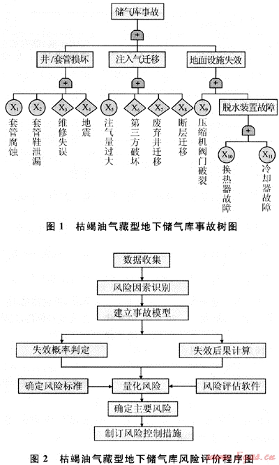 枯竭油氣藏型地下儲氣庫的安全問題至關(guān)重要,其風(fēng)險是多方面的,與儲氣庫的規(guī)劃、設(shè)計(jì)、施工、運(yùn)營、維護(hù)以及檢修的各過程密切相關(guān)。因此必須從系統(tǒng)安全的角度出發(fā),在儲氣庫事故資料統(tǒng)計(jì)分析的基礎(chǔ)上,借鑒輸氣管道風(fēng)險評價方法,結(jié)合儲氣庫特點(diǎn)對系統(tǒng)中潛在風(fēng)險因素進(jìn)行初步分類,將其劃分為12大類、33小類,并建立事故樹進(jìn)行主要風(fēng)險因素識別,進(jìn)一步利用事故模型判斷系統(tǒng)發(fā)生事故的可能性及其危害程度,確定其風(fēng)險大小,建立相應(yīng)的風(fēng)險評價程序,為制訂風(fēng)險防范措施和安全管理決策提供科學(xué)依據(jù)。