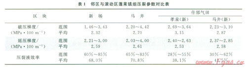 從表l可以看出,滾動(dòng)區(qū)的平均破裂壓裂較延伸壓力高出0.3~0.62MPa/100m,說(shuō)明鉆完井過(guò)程中由于工作液的濾失造成較為嚴(yán)重的近井污染,從而導(dǎo)致異常高的破裂壓力及施工初期較高的施丁壓力[1-2]。