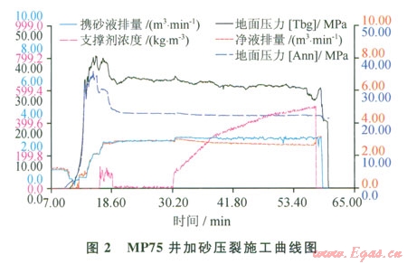 對(duì)MP75井進(jìn)行了纖維網(wǎng)絡(luò)攜砂+低稠化劑濃度+全程液氮伴注現(xiàn)場(chǎng)試驗(yàn),施工按照設(shè)計(jì)泵注程序進(jìn)行,地層破裂后,緩慢提排量至2m3/min,此過(guò)程中開始泵入支撐劑段塞,監(jiān)測(cè)壓力和泵壓顯著下降,段塞入地后,監(jiān)測(cè)壓力下降了l2.8MPa,且趨于穩(wěn)定。然后以150m3/mim排量伴注液氮,加砂初期勻速加入纖維,施工排量為2.8~3.1m3/min,監(jiān)測(cè)壓力(22~23MPa)和泵壓(31~33MPa)平穩(wěn),按設(shè)計(jì)順利完成加砂壓裂,施工曲線見圖2。