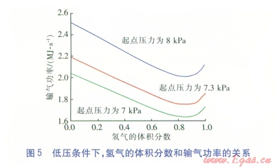由圖4、5可知,增大管道的壓力降后,無論中壓還是低壓條件,管道的輸氣功率均有顯著提升。在中壓條件下,混合氣體中氫氣的體積分?jǐn)?shù)為0.23時(shí),為保證輸氣功率不變,則起點(diǎn)壓力需從0.38MPa增大到0.384MPa。在低壓條件下,混合氣體中氫氣的體積分?jǐn)?shù)為0.23時(shí),為保證輸氣功率不變,則起點(diǎn)壓力需從7kPa增大到7.3kPa。這說明微小提升壓力降,就能保證管道的輸氣能力不變。