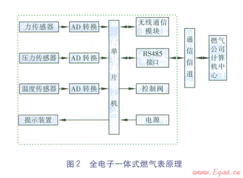 壓力傳感器、溫度傳感器、力傳感器的模擬信號經(jīng)AD轉(zhuǎn)換后傳給單片機(jī),單片機(jī)加以處理后發(fā)送給提示裝置(液晶屏、發(fā)光管和蜂鳴器)以提示用戶,并可向控制閥發(fā)出指令以實(shí)現(xiàn)通斷功能。通過通信接口(RS485)將計(jì)量數(shù)據(jù)通過通信信道發(fā)送到燃?xì)夤镜挠?jì)算機(jī)中心,或通過無線通信模塊以無線傳輸?shù)姆绞桨l(fā)送到燃?xì)夤镜挠?jì)算機(jī)中心,并接受計(jì)算機(jī)中心發(fā)出的指令實(shí)現(xiàn)控制功能。全電子一體式燃?xì)獗碓硪妶D2。