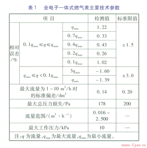 全電子一體式燃?xì)獗硗ㄟ^了無錫市計(jì)量測試中心對精確度、重復(fù)性、總壓力損失的檢測,取得了校準(zhǔn)證書。因目前沒有相應(yīng)的標(biāo)準(zhǔn),只能參照膜式燃?xì)獗淼臉?biāo)準(zhǔn),其技術(shù)指標(biāo)均達(dá)到GB/T6968-2011《膜式燃?xì)獗怼?span lang="EN-US">1.5級表的要求,主要技術(shù)參數(shù)見表l。