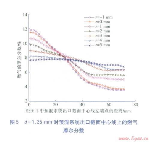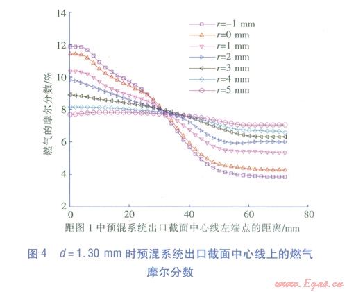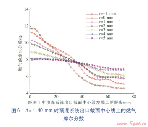 不同噴嘴直徑d 和噴嘴位置條件下,預(yù)混系統(tǒng)出口截面中心線上混合氣中燃?xì)獾哪柗謹(jǐn)?shù)見圖4~6可知,當(dāng)r=-1mm和r=0mm時(shí),中心線上燃?xì)饽柗謹(jǐn)?shù)的不一致性非常明顯,摩爾分?jǐn)?shù)波動(dòng)范圍為4%~12%。R越大,中心線上的燃?xì)獾哪柗謹(jǐn)?shù)一致性越好。當(dāng)r=4mm和5mm時(shí),中心線上燃?xì)獾哪柗謹(jǐn)?shù)幾乎相同,這說明此條件下混合效果比較好。因此,為了實(shí)現(xiàn)燃?xì)夂涂諝獾耐耆A(yù)混,取r>4mm。