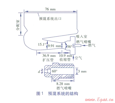 燃?xì)夂涂諝饣旌系男Ч麤Q定了燃燒效率和污染物的排放量。利用引射器實(shí)現(xiàn)燃?xì)夂涂諝馊A(yù)混,可以達(dá)到燃?xì)饪焖贌崴魅紵魅A(yù)混燃燒的目的。為了掌握預(yù)混系統(tǒng)幾何結(jié)構(gòu)參數(shù)對(duì)預(yù)混效果的影響,建立了燃?xì)夂涂諝忸A(yù)混系統(tǒng)數(shù)學(xué)模型,利用fluent軟件對(duì)燃?xì)夂涂諝忸A(yù)混系統(tǒng)進(jìn)行模擬。