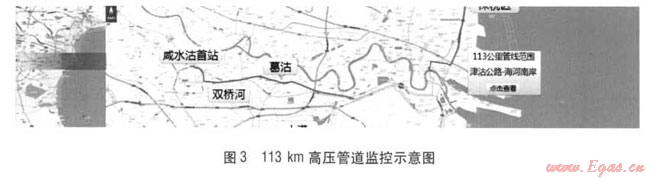 界面左邊設(shè)置了全景圖,剩余部分為濱海新區(qū)詳細(xì)地圖,圖上標(biāo)有管道走向,通過移動(dòng)導(dǎo)航條(圖中紅色區(qū)域)來選擇顯示濱海新區(qū)的詳細(xì)地圖。
