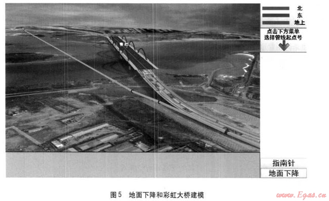 通過點(diǎn)擊“地下管道”,地面會(huì)“下降”,將地下管道顯示出來,通過地面下降可以清楚地看到管道的位置,周邊的建筑情況(見圖5)。