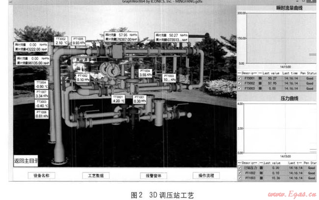 對(duì)于站點(diǎn)屬性,主要包括站區(qū)工藝、與干管的對(duì)接信息、工藝運(yùn)行狀態(tài)、運(yùn)行數(shù)據(jù)等。本系統(tǒng)通過平面流程和3D工藝模型相結(jié)合的方式提供站點(diǎn)全方位監(jiān)測(cè),提供站點(diǎn)的數(shù)據(jù)日清單報(bào)表、月清單報(bào)表及年度清單報(bào)表,提供區(qū)域所有站點(diǎn)用氣量的時(shí)、日、月、年曲線,提供站點(diǎn)用氣量的歷史曲線。