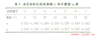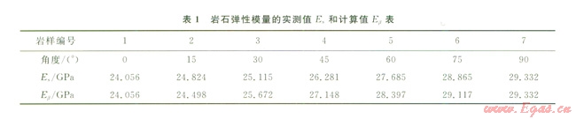 從表2可以看出,計(jì)算的彈性模量與實(shí)測值接近,最大誤差為3%。因此,只要對巖石作平行和垂直層理以及45°方向的3組樣品單軸壓縮實(shí)驗(yàn),就可用計(jì)算值來代替樣品的實(shí)測值,而不需要對每一個(gè)方向(β角)的樣品進(jìn)行單軸壓縮實(shí)驗(yàn)來確定模量,可省去大量樣品加工及實(shí)驗(yàn)工作。結(jié)果表明將層理巖石視為橫觀各向同性介質(zhì)來計(jì)算彈性模量是可行的。