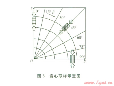為探討層理頁巖的各向異性,按一定的β方向取樣(β角為層理而與巖樣端面問的夾角)。β角從0°~90°,每隔l5°取l個(gè)樣,共計(jì)7個(gè)樣(圖3)。巖樣上下端面的不平行度小于