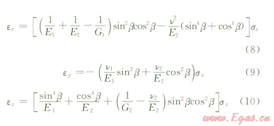 根據(jù)單軸壓縮邊界條件,若沿z軸方向壓縮,即應(yīng)力以σx=σy=τxy=τyz=τzx=0,而β≠0,由式(7)得