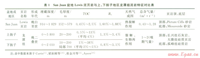 揚子地區(qū)龍?zhí)督M頁巖與美國San Juan盆地Lewis頁巖的沉積環(huán)境十分相似,故將各類參數(shù)進(jìn)行對比總結(jié)(表1)。