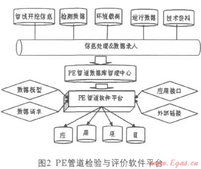 軟件平臺是IT技術(shù)在PE管道檢驗(yàn)與評價中的應(yīng)用?;跀?shù)據(jù)庫技術(shù)構(gòu)建PE管道信息數(shù)據(jù)庫,有效管理PE管道數(shù)據(jù),從而實(shí)現(xiàn)管道信息共享,并利用信息數(shù)據(jù)庫編制PE管道風(fēng)險評估系統(tǒng),構(gòu)建以風(fēng)險檢驗(yàn)為核心的PE燃?xì)夤艿腊踩u價軟件應(yīng)用平臺。PE管道檢驗(yàn)與評價軟件平臺如圖2所示。