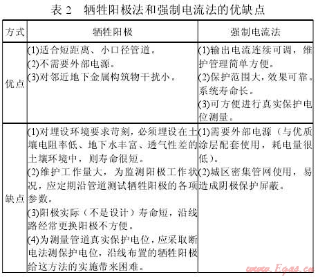 陰極保護(hù)可采用犧牲陽極法和強(qiáng)制電流法,兩種方法性能比較如表2:
