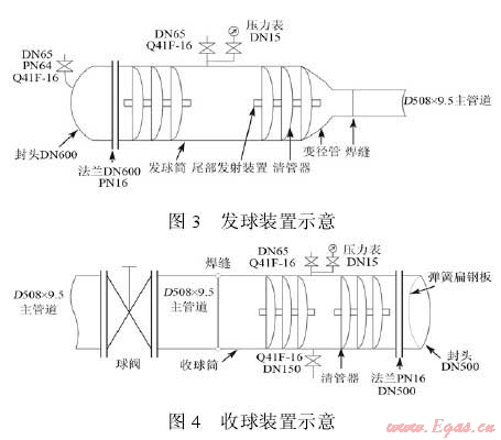管道清掃干凈后進(jìn)行注水試壓,水壓試壓每段不宜超過35km,高差不宜超過30m,管道試壓注水時(shí),宜加隔離球,且應(yīng)保持一定的球前壓力,以排除管內(nèi)空氣,試壓合格后排盡試壓水并對管道進(jìn)行干燥,直至管內(nèi)空氣水露點(diǎn)比輸送條件下最低環(huán)境溫度低5℃,若管道封閉超過3個(gè)月未投產(chǎn),應(yīng)對管道進(jìn)行充氮?dú)獗Wo(hù)。下面以主管道D508×9.5為例,其發(fā)球裝置和收球裝置示意圖如下:
