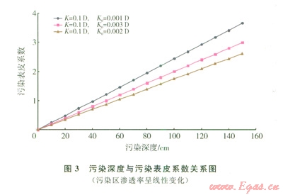 通過式(10)可以算出在不同污染深度下的表皮系數(shù)。其污染深度與污染表皮系數(shù)關(guān)系(l=1 50 cm,K=0.1 D)見圖4。從圖4可知污染表皮系數(shù)隨著污染深度的增加而增大。