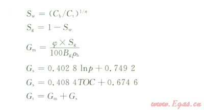 式中Sw、Sg分別為氣測(cè)地層含水率和含氣飽和度;以為氣測(cè)含烴飽和度指數(shù),一般為3~7;Cb、Ct分別為烴背景值和儲(chǔ)層異常值;Bg為天然氣體積系數(shù);TOC為總有機(jī)碳含量;Gm、Gs、Gt分別為頁(yè)巖氣儲(chǔ)層游離氣量、吸附氣量和總含氣量,m3/t。