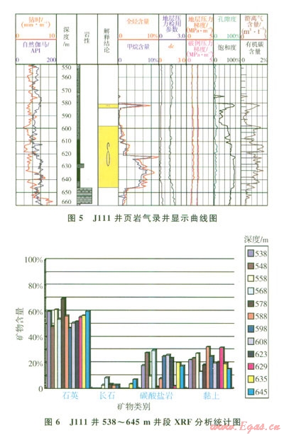 國(guó)內(nèi)現(xiàn)場(chǎng)使用元素錄井儀(X射線熒光錄井儀)可直接測(cè)量多種礦物成分,依據(jù)化學(xué)元素確定礦物成分,從而確定巖性和脆性礦物(石英+碳酸鹽巖)含量。根據(jù)公認(rèn)的國(guó)外經(jīng)驗(yàn),頁(yè)巖氣層的脆性礦物含量多大于50%。頁(yè)巖氣層脆性礦物含量高,易于壓裂,易于沿地層應(yīng)力較大方向形成人造裂縫,使儲(chǔ)層得到改造,提高滲透能力。