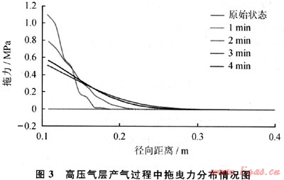 由式(3)可以看出,高壓氣體高速流動產(chǎn)生的附加拖曳力與高壓產(chǎn)氣層近井壁地帶孔隙壓力梯度變化相關(guān)。結(jié)合前面得到的高壓氣層產(chǎn)氣過程中孔隙壓力分布情況,便可得到高壓氣層產(chǎn)氣過程中拖曳力變化情況,如圖3所示。