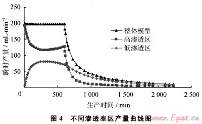 2) 開(kāi)采初期,以高滲透區(qū)供氣為主,高滲透區(qū)產(chǎn)量遠(yuǎn)大于低滲透區(qū)產(chǎn)量;開(kāi)采后期即穩(wěn)產(chǎn)期結(jié)束后,高滲透區(qū)產(chǎn)量遞減很快,而低滲透區(qū)產(chǎn)量遞減比較緩慢,且低滲透區(qū)產(chǎn)量貢獻(xiàn)率逐漸增大,即生產(chǎn)后期小產(chǎn)量生產(chǎn)時(shí)以低滲透區(qū)供氣為主(圖4)。低滲透區(qū)滲透率越高,則產(chǎn)量貢獻(xiàn)率越大。