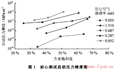 啟動(dòng)壓力梯度定義為作用在流體上的壓差達(dá)到一定程度時(shí),流體克服黏滯力開(kāi)始流動(dòng)時(shí)的壓力梯度。在低滲透氣藏中,氣體滲流是否存在啟動(dòng)壓力梯度以及啟動(dòng)壓力梯度產(chǎn)生的條件一直是石油工作者研究和爭(zhēng)論的焦點(diǎn)之一。持肯定觀點(diǎn)的學(xué)者認(rèn)為天然氣在高溫高壓條件下與孔隙界面會(huì)產(chǎn)生一定的界面效應(yīng),或因?yàn)榭紫吨兴拇嬖诙率箽怏w滲流存在一定的啟動(dòng)壓力梯度。持否定觀點(diǎn)的研究人員認(rèn)為天然氣分子小,易于流動(dòng),在孔隙介質(zhì)中流動(dòng)不存在啟動(dòng)壓力梯度,如果說(shuō)因?yàn)榭紫吨泻幸欢柡投鹊乃率箽怏w在某些條件下不流動(dòng),應(yīng)歸于兩相滲流的問(wèn)題。筆者認(rèn)為:?jiǎn)?dòng)壓力梯度概念能較好的反映氣體流動(dòng)的動(dòng)態(tài)特征,綜合反應(yīng)了儲(chǔ)層物性、含水及驅(qū)動(dòng)壓力對(duì)氣體滲流的影響,在滲流方程中引入啟動(dòng)壓力梯度,能更好地描述低滲儲(chǔ)層的滲流特征,確定氣井的有效動(dòng)用范圍,為低滲氣藏開(kāi)發(fā)井距的確定和井網(wǎng)優(yōu)化部署提供依據(jù)。根據(jù)實(shí)驗(yàn)分析,同一物性巖樣,含水飽和度越大,啟動(dòng)壓力梯度越大;巖石物性越差,啟動(dòng)壓力梯度越大,并且受含水飽和度影響更顯著(圖1)。