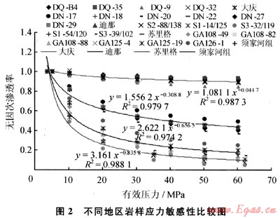 低滲透儲(chǔ)層巖石孔隙結(jié)構(gòu)復(fù)雜,吼道細(xì)小,應(yīng)力的變化致使其孔喉細(xì)微的變化,就可能引起其滲透率相對(duì)值的較大變化,產(chǎn)生較強(qiáng)的應(yīng)力敏感性。對(duì)于不同類(lèi)型儲(chǔ)層由于巖石礦物與孔隙結(jié)構(gòu)的差異,其孔隙度和滲透率隨有效壓力的變化特征有所不同,總的來(lái)說(shuō),低滲透儲(chǔ)層開(kāi)發(fā)過(guò)程中的滲透率隨有效壓力的變化均可用冪函數(shù)表達(dá),初始滲透率越低,下降速率越快,下降幅度越大。但不同類(lèi)型儲(chǔ)層又有很大的差異,除裂縫型儲(chǔ)層和孔隙型差別很大外,不同地區(qū)不同巖類(lèi)的滲透率隨有效壓力變化也有很大的不同。研究中選取常規(guī)滲透率相近(K=0.3~0.6mD)的不同氣藏巖樣進(jìn)行實(shí)驗(yàn),結(jié)果如圖2所示。隨著有效壓力的增大,大慶火山巖的滲透率下降慢,下降幅度??;蘇里格氣田滲透率下降速率最快。在相同有效壓力下的滲透率下降幅度大小依次是:蘇里格砂巖>川渝上三疊統(tǒng)須家河組砂巖>塔里木迪那砂巖>大慶火山巖。