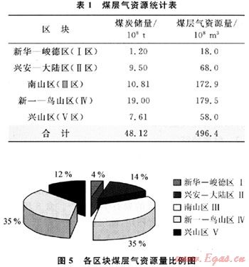 鶴崗礦區(qū)煤炭資源豐富,主要分布于1500m以淺。筆者以垂深1500m為界線,將鶴崗礦區(qū)劃分為5個(gè)區(qū)塊,分別對其煤層氣資源量進(jìn)行預(yù)測:煤炭儲(chǔ)量共有48.12×104t,含氣量為7~16m3/t,預(yù)測煤層氣資源量為496.4×108m3(表1)。其中南山區(qū)(Ⅲ區(qū))和新一-鳥山區(qū)(Ⅳ區(qū))為主要含氣區(qū),資源量分別為172.9×108m3和179.5×108m3,占1500m以淺煤層氣總資源量的70%(圖5)[5]。
