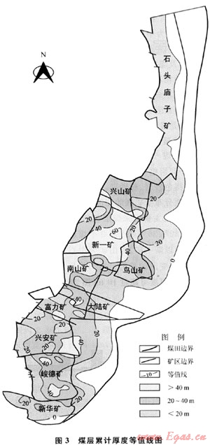 對125口井的煤層累計(jì)厚度進(jìn)行了統(tǒng)計(jì),煤層累計(jì)厚度為30~70m。從全區(qū)煤層發(fā)育情況來看,橫向上煤層連續(xù)性較好,但厚度上具有多個(gè)聚煤中心,其中大于40m的主要分布在新一、南山礦(分布面積為24.2km2)和興安、峻德礦的局部地區(qū)(分布面積為5.5km2);石頭廟子礦區(qū)煤層發(fā)育較差,厚度一般小于10m(圖3)。在南山、新一礦煤層厚度較大,直接決定了煤層氣生成及吸附能力較其他礦區(qū)強(qiáng),導(dǎo)致瓦斯涌出量相對偏高。