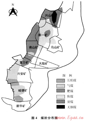 例如峻德、興安礦區(qū)主要為氣煤和長焰煤,興安北部的富力、大陸、南山礦變?yōu)榉拭?,至新一礦深部、鳥山區(qū)變?yōu)榻姑?,再向北分布有貧煤和無煙煤(圖4)。因此煤變質(zhì)程度較高的南山、新一礦煤層瓦斯含量相應(yīng)增高,使得礦井瓦斯涌出量較大,屬高瓦斯突出礦區(qū)。