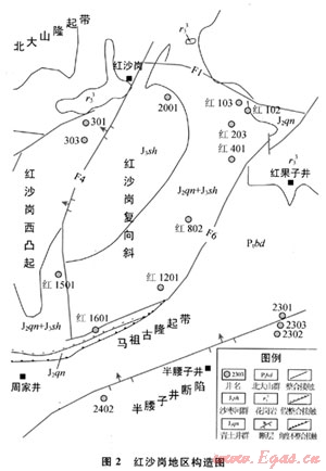 紅沙崗呈北東翹起向南西傾伏的寬緩復式向斜構(gòu)造[4],軸向北東東(約73°),軸長大于5km;西北翼平緩,傾角10°~20°;東南翼較陡,傾角一般超過25°,北部最陡處可超過55°,次級褶皺、斷裂發(fā)育。