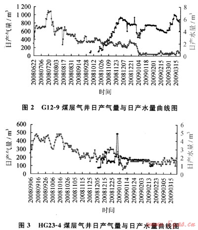 由于壓實(shí)作用,該部位裂隙不發(fā)育,其儲(chǔ)層中水的流動(dòng)類(lèi)似于地下水流動(dòng)的“排泄區(qū)”。在排水采氣過(guò)程中,接受來(lái)自翼部?jī)?chǔ)層中水的補(bǔ)給,因其處于“排泄區(qū)”,儲(chǔ)層中水匯集于此,排水強(qiáng)度最大,產(chǎn)水量很大,壓降漏斗卻很小[6~8]。因此,向斜部位的煤儲(chǔ)層盡管含氣量相對(duì)較高,但連通性較差,煤層氣井穩(wěn)定產(chǎn)氣量一般不高,多在800~1200m3/a,產(chǎn)水量較大。樊莊區(qū)塊內(nèi)HG24-3、HG23-4井等煤層氣井位于向斜核部位置,產(chǎn)氣量低且不穩(wěn)定;HG23-4井產(chǎn)水量相對(duì)較大,排采近200d后,產(chǎn)水量約1.7m3/a(圖3)。