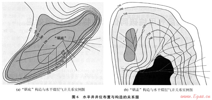 3) 對(duì)于“鍋底”構(gòu)造發(fā)育部位的水平井部署,其井筒部位相當(dāng)于煤層水的排泄區(qū),有利于煤層水的排采,盡管前期可能產(chǎn)氣效果欠佳,但排采到一定階段,這類(lèi)水平井產(chǎn)氣效果較好;而對(duì)于“鍋蓋”構(gòu)造發(fā)育部位的水平井部署,其井筒部位相當(dāng)于煤層水的補(bǔ)給區(qū),不利于煤層水的排采,這類(lèi)水平井,前期可能開(kāi)始產(chǎn)氣時(shí)間較短,但衰減也快,不能很好地達(dá)到儲(chǔ)層降壓的目的,對(duì)后期排采不利。