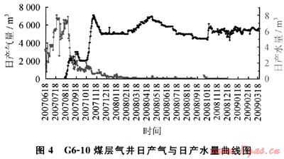 因此,在這一部位,含氣量和煤儲(chǔ)層的連通性達(dá)到一種較為理想的搭配,其煤層氣井的穩(wěn)定產(chǎn)氣量一般較好,多在4500m3/d左右,產(chǎn)水量也介于上述2種位置之間(圖4)。樊莊區(qū)塊內(nèi),G6-10、G7-11井等高產(chǎn)煤層氣井均在這種翼部位置。